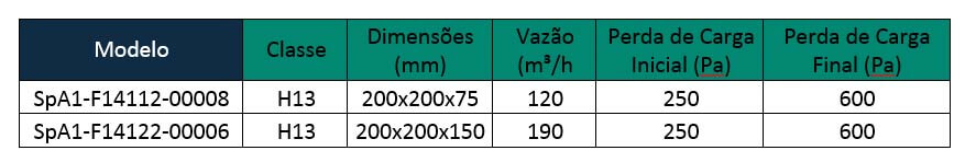 Eficiência: Filtros com alta eficiência, H13 eficiência de 99,98%, H14 eficiência de 99,998%, U15 eficiência de para partículas de 0,3µ;